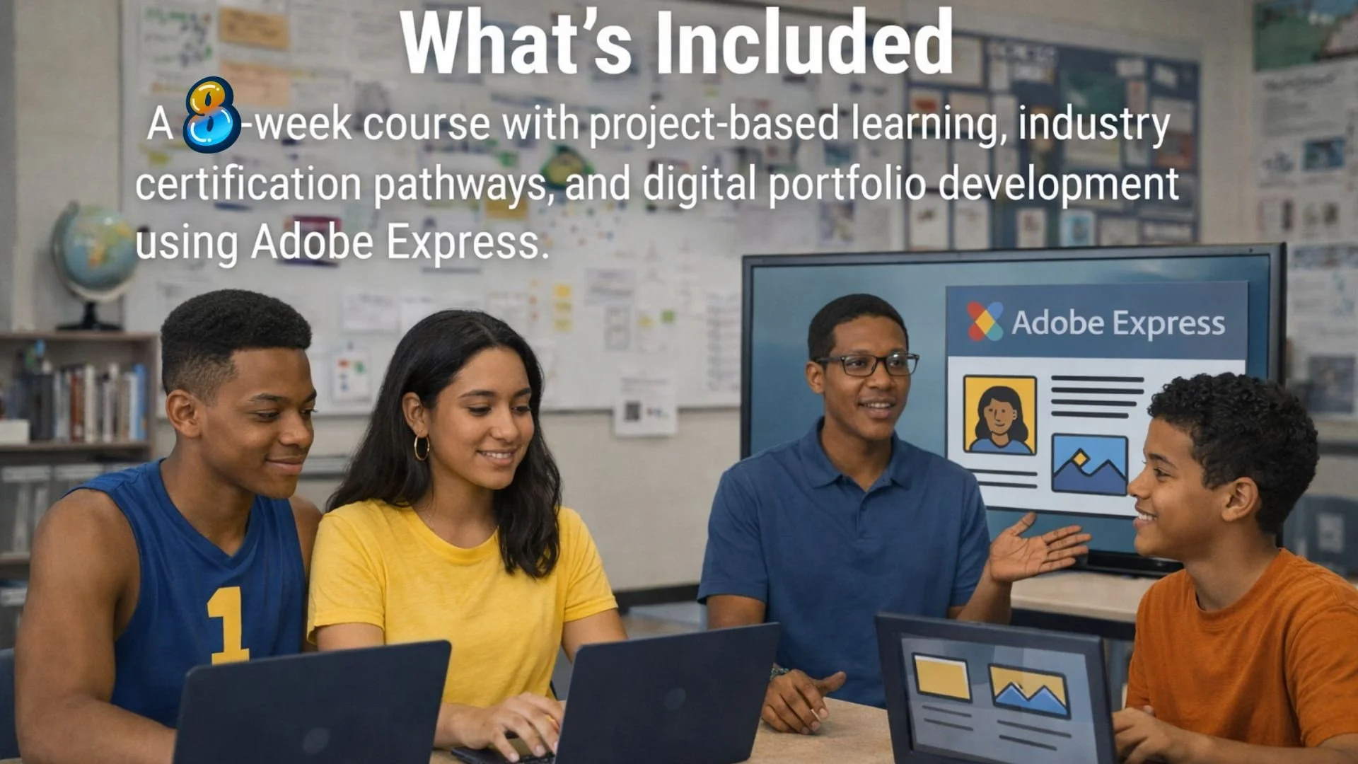 A 8‑week, project‑based workforce development experience that blends industry certification pathways in AI and cybersecurity with hands‑on digital portfolio creation using Adobe Express. Students build career‑ready skills through real‑world challenges, mentorship, and a capstone pitch that showcases their learning and impact.